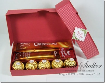 I’ve filled them all with 5 Ferrero Rocher Chocolates in the front compartments and then 5 Cappuccino or Hot Chocolate satchels (some have a mixture of the 2) in the back compartment.