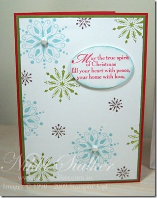 I’ve kept with the same colour theme as in the Ski Slope DSP and stamped the snowflakes from the Snow Swirled stamp set, added a couple of half-backed pearls from the Pretties Kit, used the Wide Oval punch to punch out the sentiment, daubered the edges and mounted using Stampin’ Dimensionals.