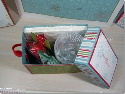 The box is one of Becky Roberts designs from her 12 Days of Christmas. To keep it all coordinated I’ve used the Ski Slopes DSP and stamped the lid with the Snow Swirled Stamp set.