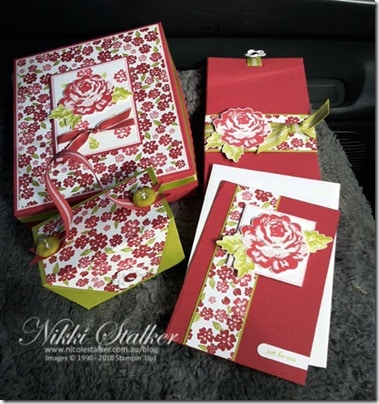 In her questionnaire she listed that she liked the stamp set “A Rose is a Rose” so I decide to use it before it retires. I teamed it with the Bella Rose DSP and coordinating cardstock, ribbon & ink colours.