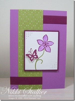 Nikki love the card, may be a sentiment stamped on white and layered on the bottom Rich Razzleberry piece, I would have probably layered the DSP as well, but thats me, I just can’t seem to put DSP on a card without layering it, a phobia I have.. A great sketch though lots of potential, I think I will borrow it and use it this weekend.