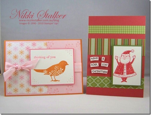 The Christmas card is using the ‘A Holly, Jolly Christmas’ stamp set and Holiday Treasures DSP, coordinating colour inks and cardstock. I’ve cut up the Christmas sentiment for something a little different and mounted onto the card using Stampin’ Dimensionals. I’ve also added some Dazzling Diamonds to the pom pom on Santa’s hat and also Santa’s jacket buttons to jazz it up a little. Unfortunately the ‘A Holly, Jolly Christmas’ stamp set is one on the Last Chance List so if it’s a set you like don’t delay, place an order today so you don’t miss out.