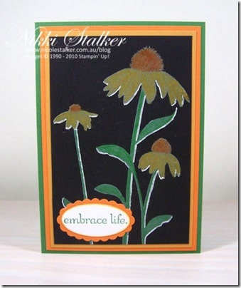 I’ve already showed you the Upsy Daisy Black Magic Technique sample cards I made for our Team Stamp Camp demonstration last month but I also made up a couple using another set. I’m not liking these as much as the Upsy Daisy ones in Pacific Point, Basic Black & Whisper White but I thought I’d show them to you anyway. Maybe it’s just me……