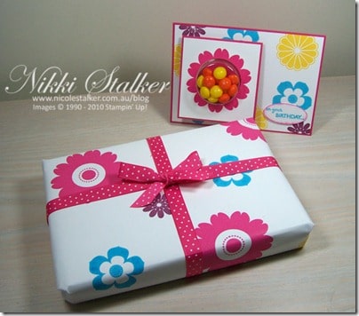 I recently saw a new way (well new to me anyway) of making an opening for the sweet treat cups to remove the contents without damaging the card and wanted to try it out. The large flower from the Petal Pizzazz stamp set is perfect for the Sweet Treat cups so that’s what I’ve used. The colours are really not me as they are too bright, but for a 6 year old I’m sure they are fine.