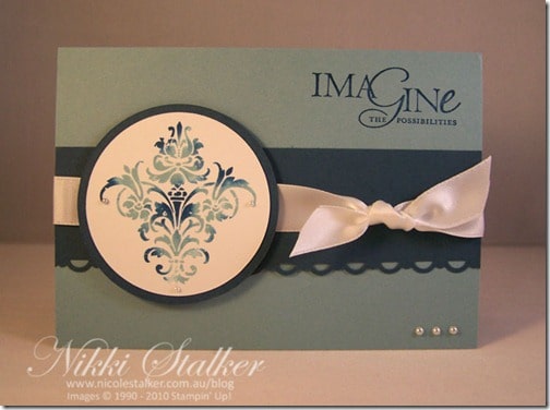 I’ve used more pearls, this time the medium size, the new Scallop Trim Border Punch, new Whisper White Satin Ribbon and the sentiment is from the new stamp set ‘Word Play’.