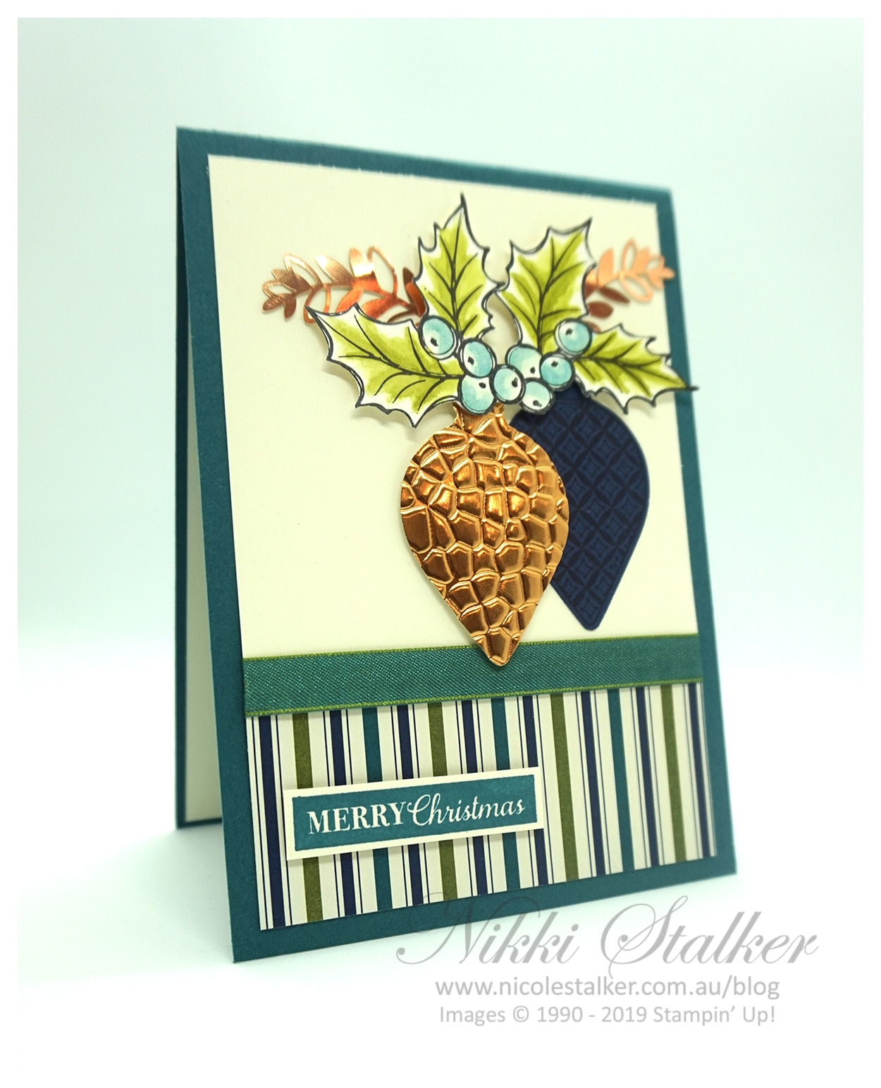 I love the copper foil embossed with the Hammered Metal 3D Embossing Folder, which is punched out using the coordinating Gleaming Ornaments Punch pack. I’ve also added some of the Brightly Gleaming Foil Elements from the suite. The holly image has been stamped using Stazon Jet Black onto Shimmer White Cardstock and coloured with aqua painters and inkpads.