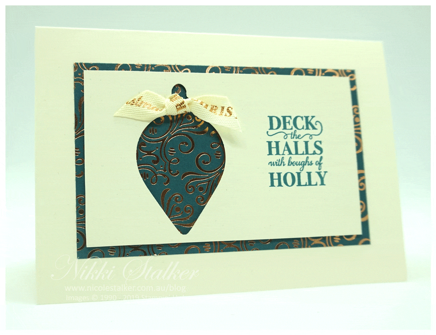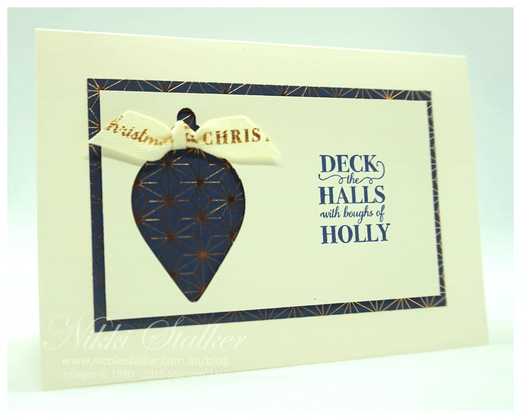 These last cards are great for classes as they are so quick and easy to make. One thing I will mention is that to get my placement correct with the punch I first punched out the ornament from scrap, then added some removeable adhesive to the back, placed it on the top layer as a guide and then punched out the shape. This makes it so much easier to get the ornament in the right spot, with an even gap at top and bottom and the ornament straight.