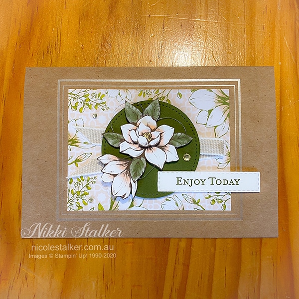 On this card I’ve added one of the smaller Memories & More Cards to the Large Speciality Memories & More Card inside the silver frame using Multipurpose Glue. I’ve added a piece of ribbon from the Magnolia Lane Ribbon Combo pack, die cut a stitched circle die from the Stitched Shaped die set in Mossy Meadow and adhered over the ribbon using Stampin’ Dimensionals. I then added some Silver Metallic Thread behind my fussy cut flower image before attaching to the card using Stampin’ Dimensionals on top of the Mossy Meadow circle. I stamped my sentiment from the Good Morning Magnolia stamp set in Mossy Meadow on some Whisper White card and due cut using the Stitched Rectangle Dies and mounted to the card. Lastly I added some Rhinestone Basic Jewels for a little bit of bling.