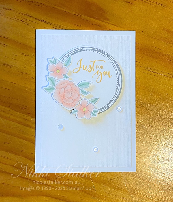 I started out by stamping the circle frame in Smoky Slate on Whisper White card and then I’ve used the Layering Cirlce Dies to die cut the outside of the frame. Next I stamped the sentiment from Rare Blessings in So Saffron ink on the frame piece. My flowers are from the Tea Together stamp set. I have stamped them onto Whisper White card using 3rd generation Smoky Slate ink and then coloured them with Petal Pink, Mint Macaron & So Saffron Stampin’ Blends before die cutting with the coordinating Tea Time Dies. My flowers have been mounted to the edge of the Swirly Frame piece using Stampin’ Dimentionals. I have embossed a piece of Whisper White using the Subtles Embossing Folder which is adhered to the Whisper White Thick cardbase using Multipurpose Liquid Glue. I have then mounted the frame using Stampin’ Dimensionals and lastly added some Basic Adhesive-Backed Sequins.