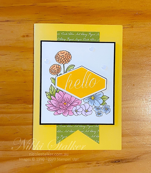 I stamped the main image onto Whisper White card using Memento Tuxedo Black. I have then coloured it in using Rococo Rose, Seaside Spray, Purple Posy, Pumpkin Pie & Daffodil Delight Blends. I then stamped the ‘hello’ in Daffodil Delight and punched out using the coordinating Tailored Tag punch. I’ve mounted the sentiment using Stampin’ Dimensionals. I have then layered my main piece onto Basic Black card. My base card is Daffodil Delight and I’ve added a strip of Old Olive print (from the Brights 6×6 DSP pack) which has the bottom edge punch using the Banner Triple Punch. I have then added the main piece to the base using Stampin’ Dimensionals. Lastly I’ve added some Basic Adhesive-Backed Sequins.