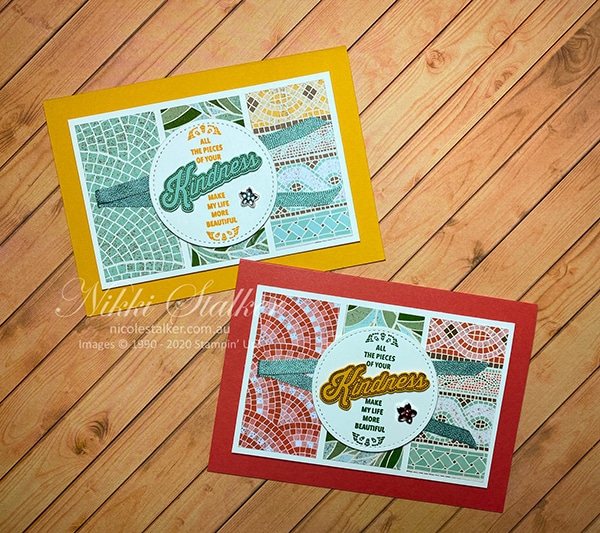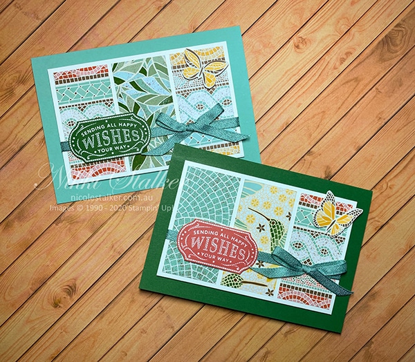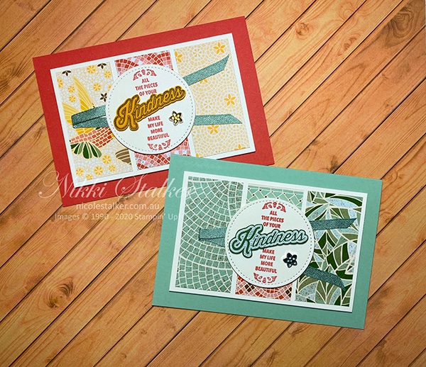 I’ve used card colours to coordinate with the paper colours, the stamps are from the coordinating Mosaic Madness stamp set, the bird & butterfly images are cut from one of the sheets of dsp and the ribbon and flower embellishments are part of this suite too. These cards are very quick and easy to make once you decide on the Designer Series Paper and card colours.
