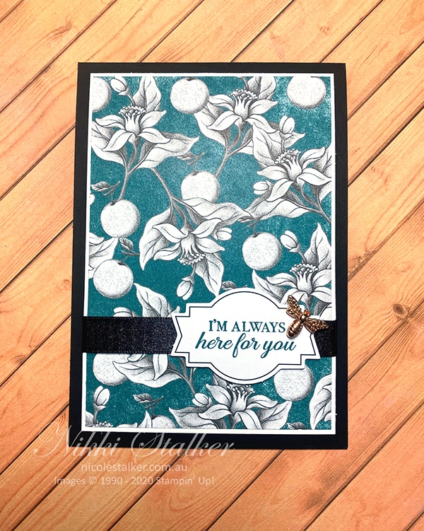 Again I have started with a Basic Black base card, cut a piece of the Pretty Peacock dsp and layered onto a piece of Whisper White. I have then wrapped a piece of Basic Black Satin ribbon around and adhered using Mini Glue Dots. This whole piece has then been glued to the base card. I have stamped my sentiment in Pretty Peacock onto one of the label die cuts and mounted to the card using Stampin’ Dimensionals. Final touch again is to add one of the bee embellishments.