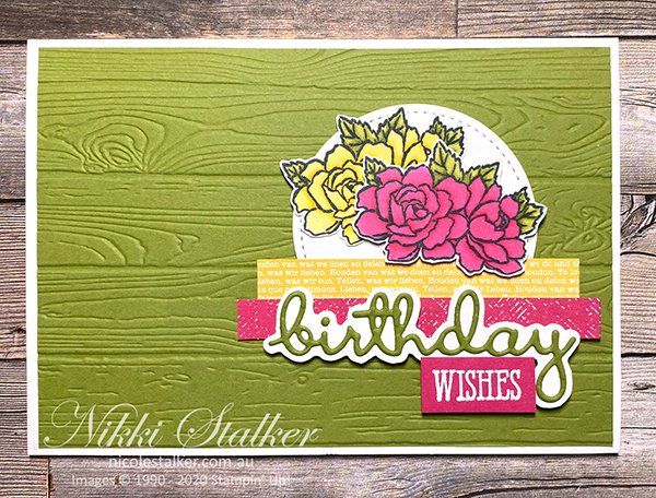 For my card I started out with a base card of Whisper White Thick which I have then added a layer of Old Olive that has been embossed using the Pinewood Planks 3D folder. Next I die cut a circle in Whisper White using the Stitched Shapes Dies. I’ve added a strip of Daffodil Delight and Melon Mambo designer series papers from the Brights 6 x 6 DSP packs. I then die cut the ‘birthday’ in Old Olive using the Well Written dies and layered it onto a Whisper White piece which I created from tracing the die and then fussy cutting. Next I stamped and heat embossed in white the ‘WISHES’ sentiment onto Melon Mambo cardstock which is from the Well Said stamp set. Lastly I have stamped the floral image from the Four Season Floral stamp set in the Beginners Brochure onto Whisper White twice using Memento Tuxedo Black and then coloured using Melon Mambo, Daffodil Delight and Old Olive Stampin’ Blends. Once coloured I fussy cut them and mounted to the card.