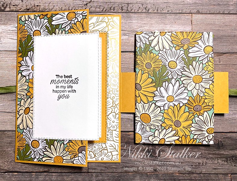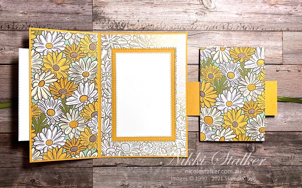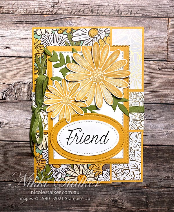 I’m not really sure what this ‘fancy fold’ is called so please feel free to let me know. The inspiration actually came from one of my friends. A few of us catch up every fortnight and it had been a while since any of us had done much stamping so at the beginning of the year one of the ladies suggested once a month one person does a shoebox swap so we at least make one card a month……lol. This same lady made one of these style cards last month so I decided to recreate it (with a few minor adaptations) using the soon to retire Ornate Garden Speciality DSP which coordinates well with the Daisy Lane stamp set.