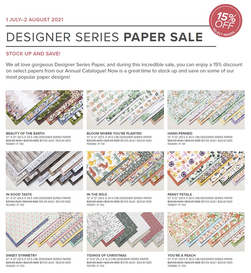 Stampin’ Up!’s Designer Series Paper sale is on again this year from 1st July – 2nd August, 2021. You have the opportunity to purchase a selection of packs for 15% off.