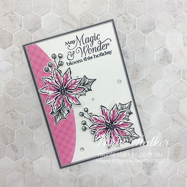 My outline images were all stamped in Memento Tuxedo Black onto Basic White cardstock. I have then stamped the corresponding solid image using Basic Gray, Smoky Slate and Polished Pink inkpads before die cutting using the coordinating Poinsettia Dies. I have layered 2 of the Poinsettia images together using a Stampin’ Dimensional between the 2 pieces. The images have been mounted to the Basic White piece using either glue or dimensionals.
