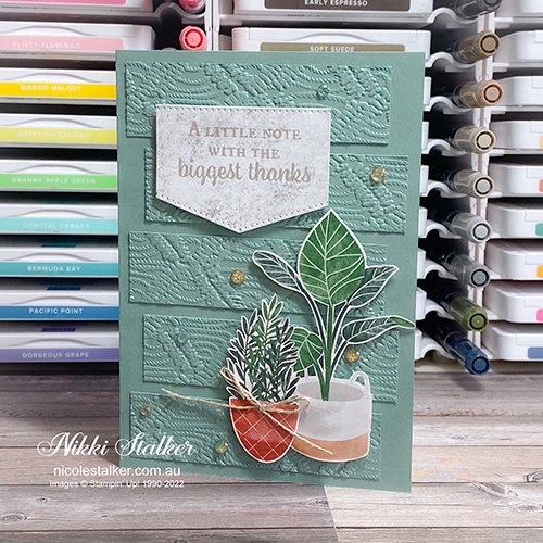 Next I adhered the embossed pieces to the card, as shown, using Multipurpose Liquid Glue. The plants where then mounted to the card using Stampin’ Dimensionals before adding a Linen Thread bow using a Mini Glue Dot.