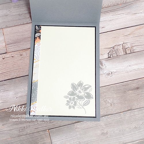 Next, I decorated the inside of the card by stamping the floral image in Basic Gray onto the remaining piece of Very Vanilla cardstock. I also added an offcut of the front panel piece to the side before mounting to the Basic Black remaing piece. This was then mounted to the inside of the card.