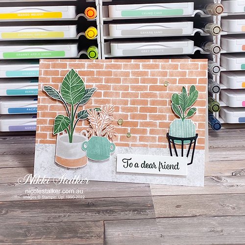 To make this card I started with a Basic White Thick A5 card, folded in half. I have added 2 pieces of dsp to cover the whole front. Next, I fussy cut out some images from the dsp. I then die cut the plant holder in Basic Black cardstock. Next, I put the fussy cut pot plant into the pot holder, added Stampin’ Dimensionals to the back of the pot and glue to the bottom edge of the pot holder and mounted to the card. I added Stampin’ Dimensionals to the other 2 fussy cut images and mounted them to the card also. Next, I stamped my sentiment onto a piece of Basic White cardstock using Evening Evergreen ink, which was then mounted to the card again using Stampin’ Dimensionals.